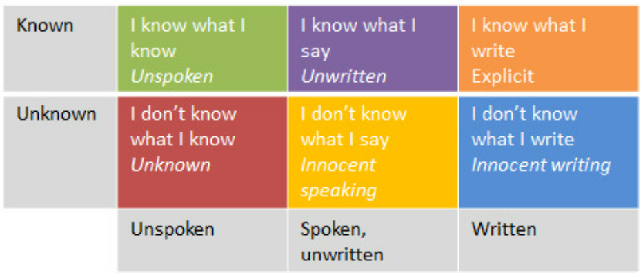 But as well as varying on this axis of unspoken to written down, knowledge also varies as to whether it’s known or unknown to the knower. Yes, that’s right – we don’t always know what we know or say ourselves.